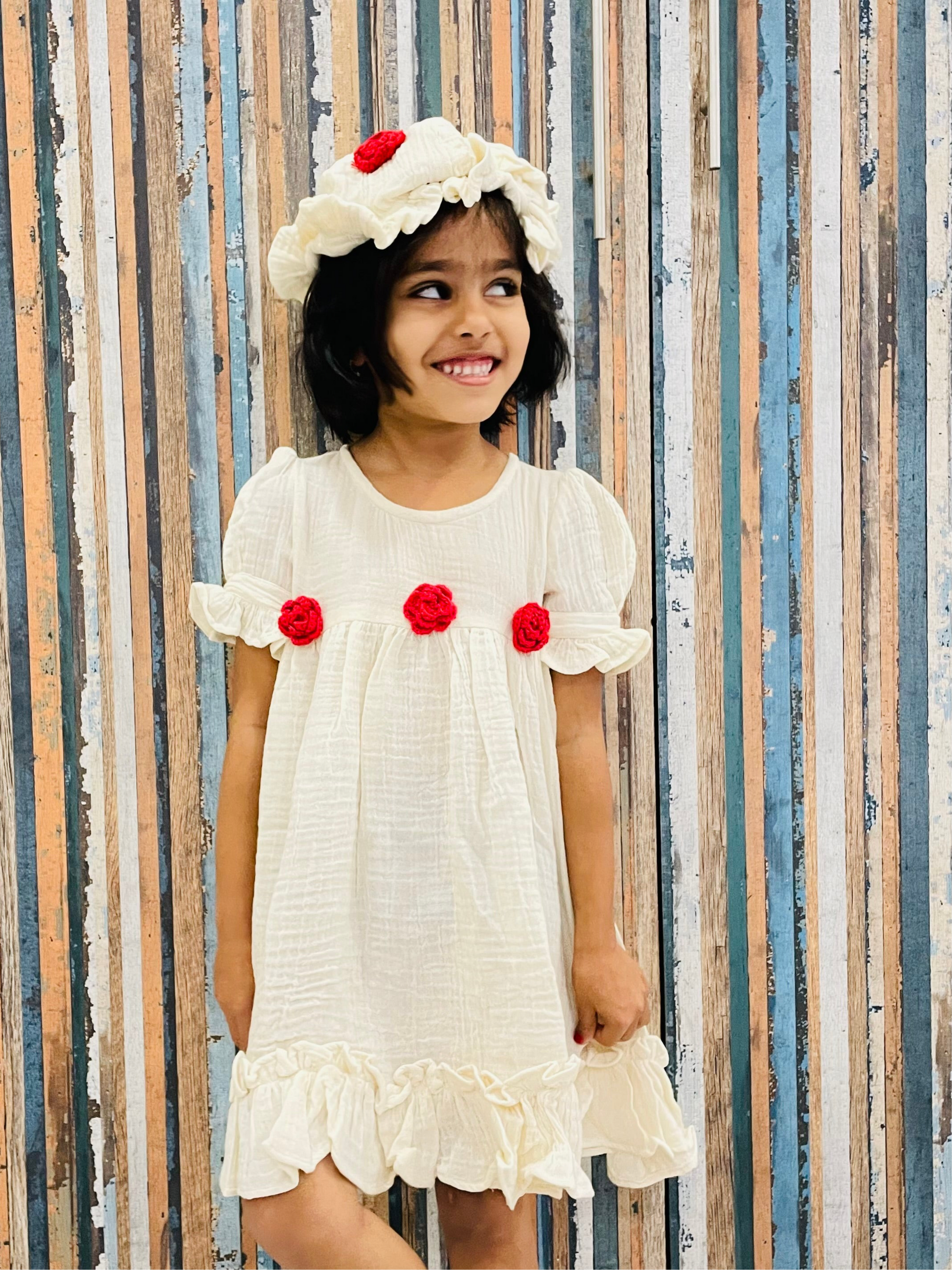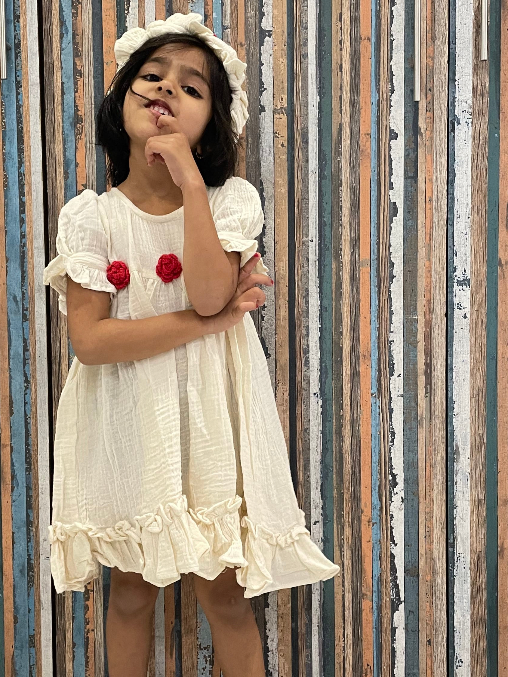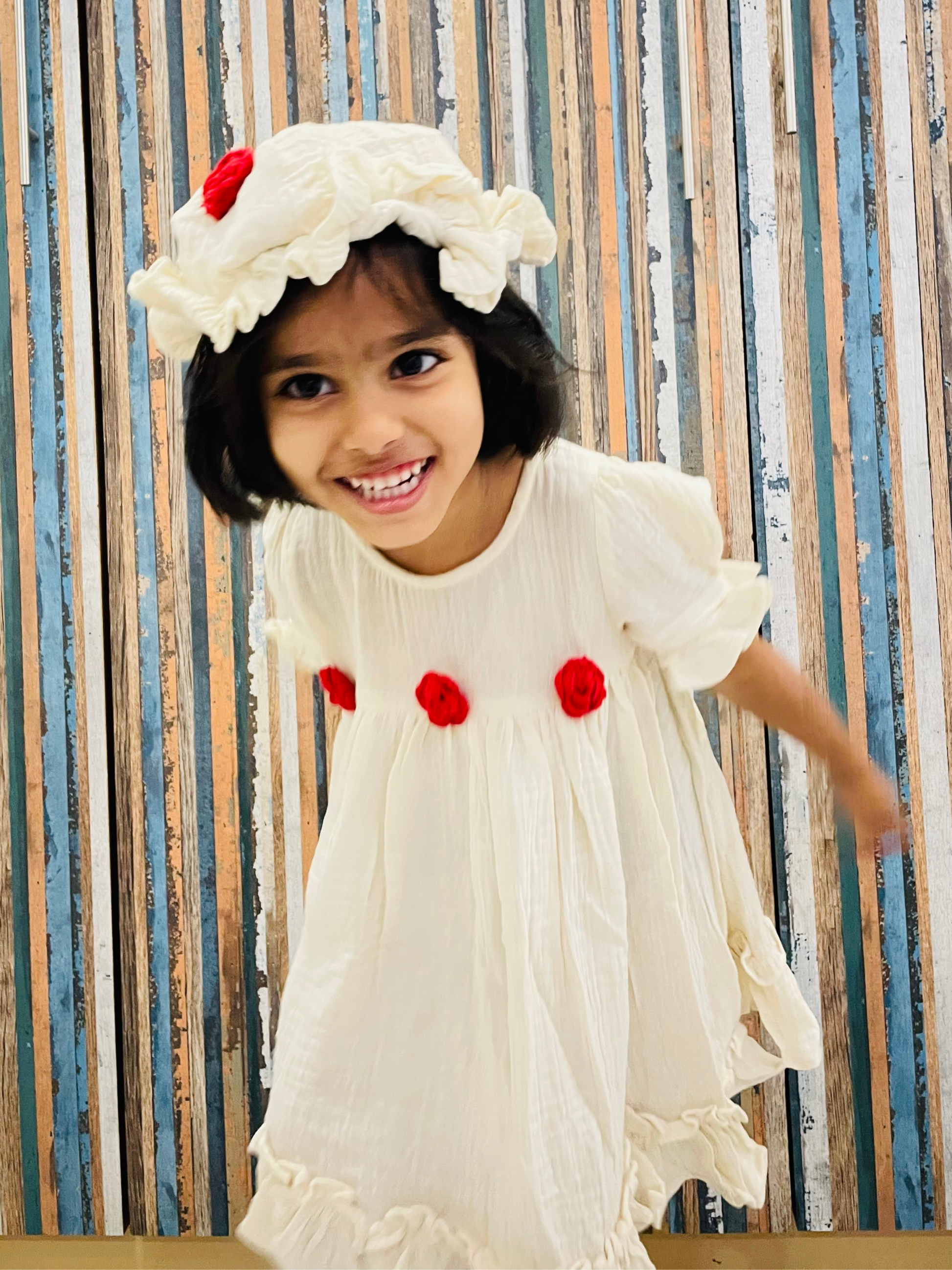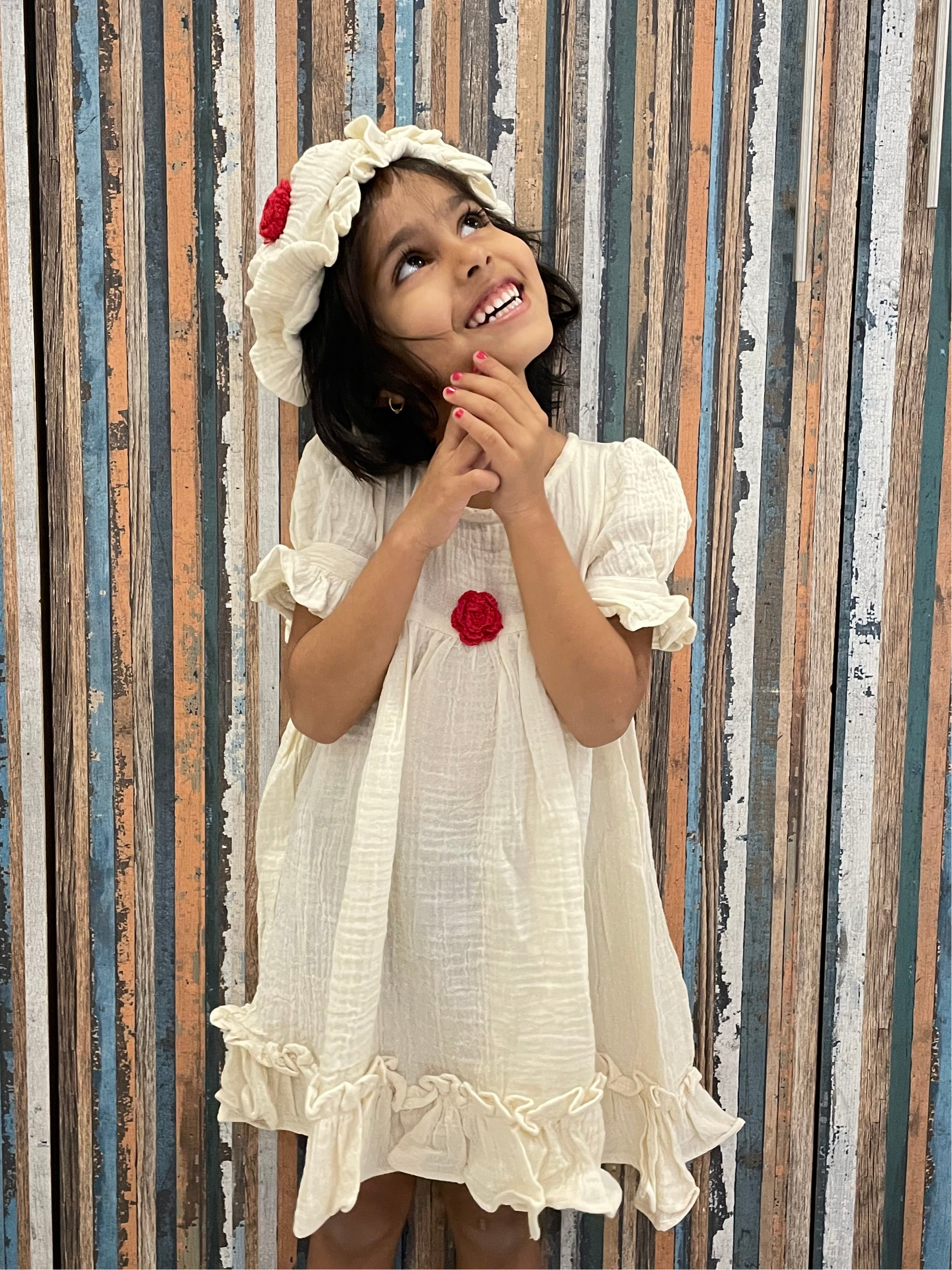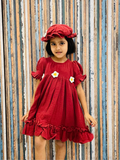 Let your little one shine in our Pretty Ruffle Frock. Designed for comfort and style, this vibrant frock features playful ruffle details and a charming bow tie accent. Made with breathable fabric, it's lightweight and comfy—ideal for warm weather outings. Plus, it comes with an adorable matching hat for a complete look. Available in two elegant shades—Maroon and off White—this dress is a must-have for every little fashionista.